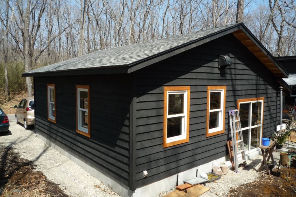 那須高原の森の中で、シダーガレージをショップにお使いいただいています。外壁塗装はオリンピックマキシマムの「EBONY」という黒色で、シックな自然感を。室内は構造の木材ををそのまま表し、親しみやすいイメージを醸し出しています。