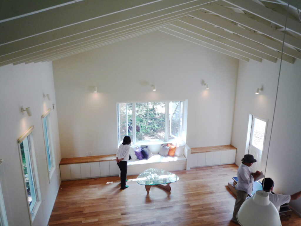 キッチンダイニングスペースの屋根は、底辺が山形の「シザーストラス」で組まれ、構造の美しさと一層の開放感を演出。また、一部2階建てとして、屋根裏的な寝室も備える。