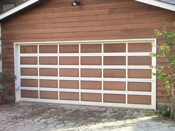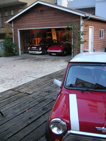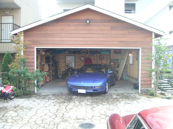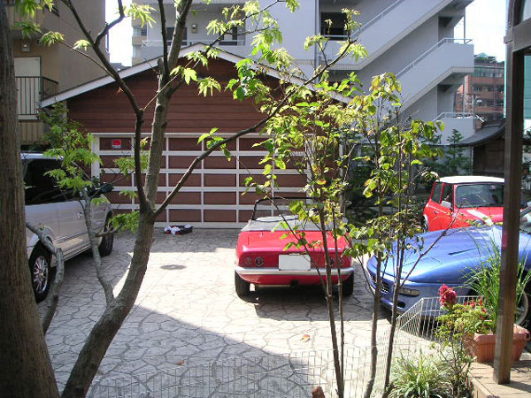 木目が映える都会のガレージ。枕木とコンクリートが演出する、独自の風景
