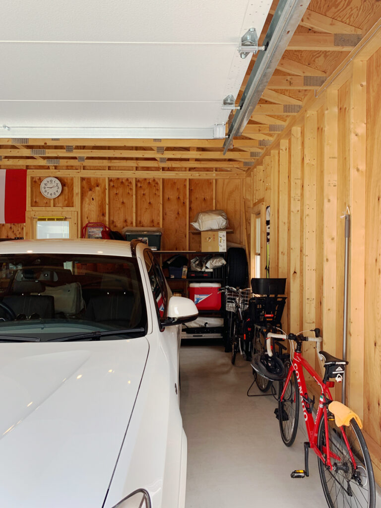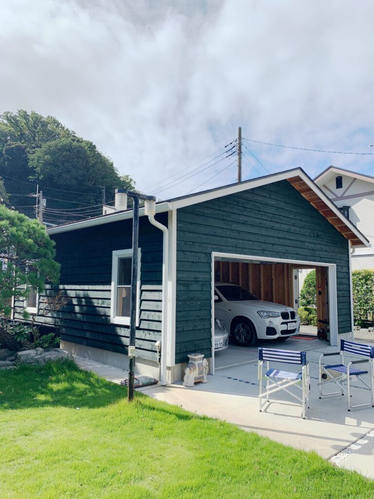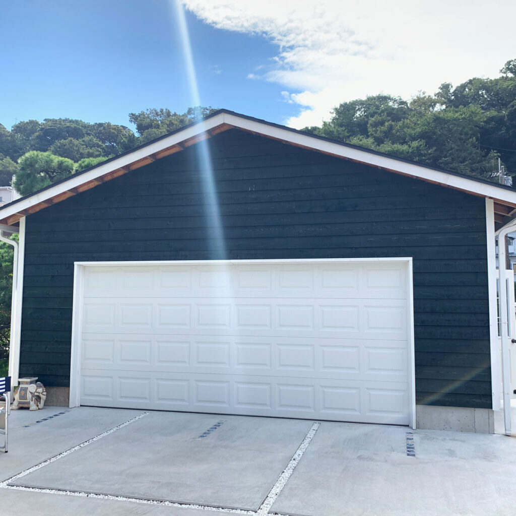 2018年完成。外壁の塗装はキシラデコールの[タンネングリーン]を使用。ホワイトのガレージドアやその他の建具と非常に相性がいい色で、派手ではないものの上品な華やかさがあります。