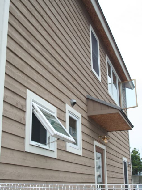 窓を開ければ、停泊中のヨットのマスト越しに海が望める理想的な環境のため、2階のリビングには大きな3連窓を設置。