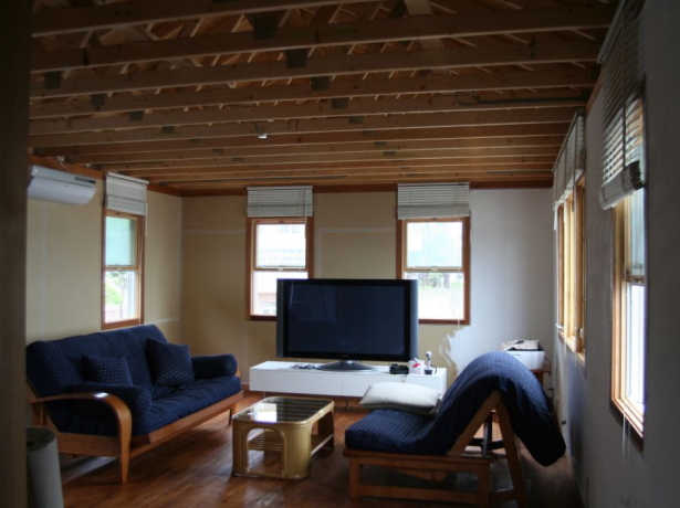 22畳のLDKは天井トラスを露出させた開放的な雰囲気、1階は、木製のガレージドアを開けると18畳の工房になっています。