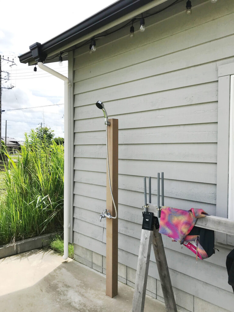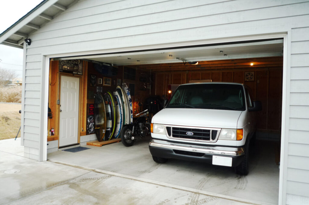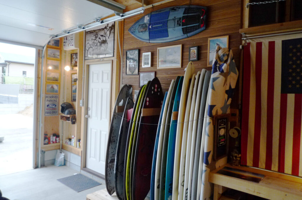 2016年、海からほど近い住宅地に完成。すっきりとしたグレーの外壁と白いドアが、愛車のフォード・エコノラインとも良く似合っています。壁に立てかけられたボードや西海岸を思わせるインテリア、建物の外には独立したシャワーを設置しており、まさにサーファーズガレージのお手本にしたい素敵なガレージです。