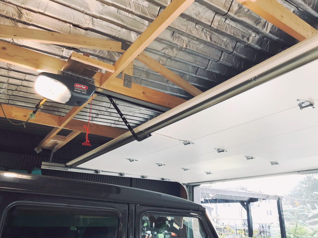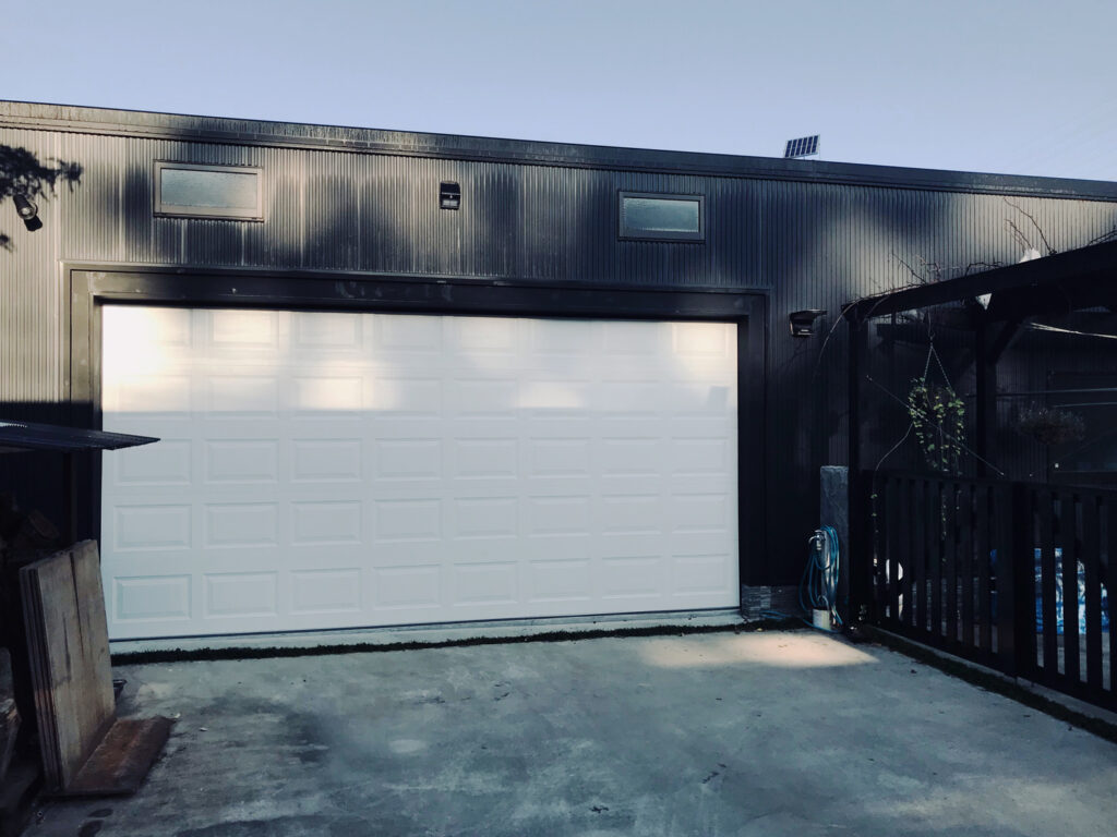 2020年完成。ご自身でDIYで建てられたガレージに取り付けました。海外に住まわれていた経験から積極的にDIYされるようになったそうで、母屋からガレージへのアプローチやパーゴラなど、広い敷地にはご自身で施工されたものがたくさんあります。取り付けたのは16×8フィートのスチール製レイズドパネルドア。黒で統一された外観に白が映えています。内部はツーバイ材のトラスで骨組みされており、日本の住宅にみられる一般的なビルトインの車庫とは全く違う様相です。