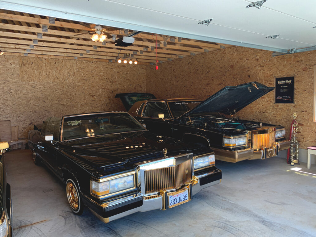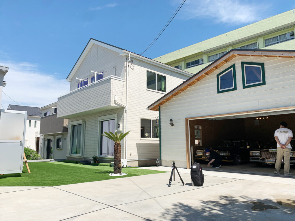 2021年完成。思わず目を引くキャデラックが3台格納された大型ガレージ。車のハードな印象とは裏腹に、ガレージの外観はどちらかというとソフトな西海岸風。古き良きアメリカを存分に感じられる空間に仕上がっています。