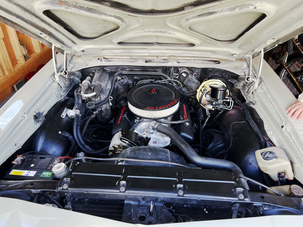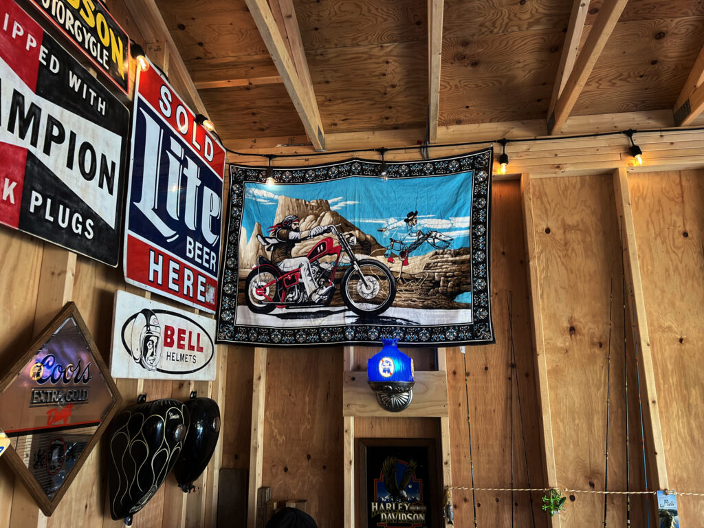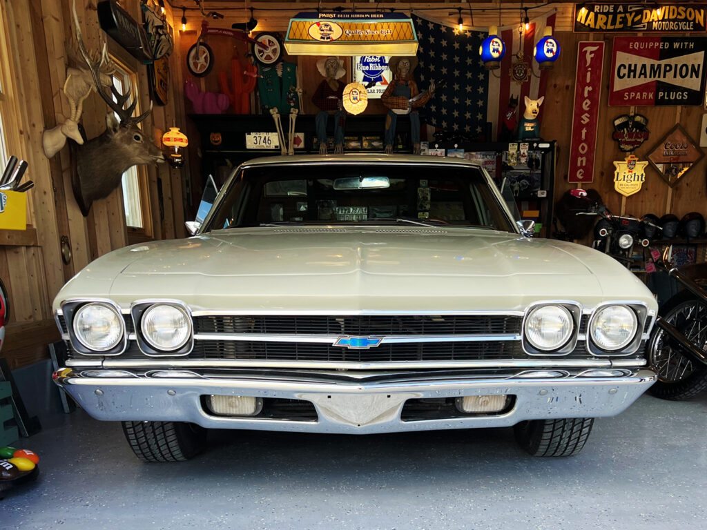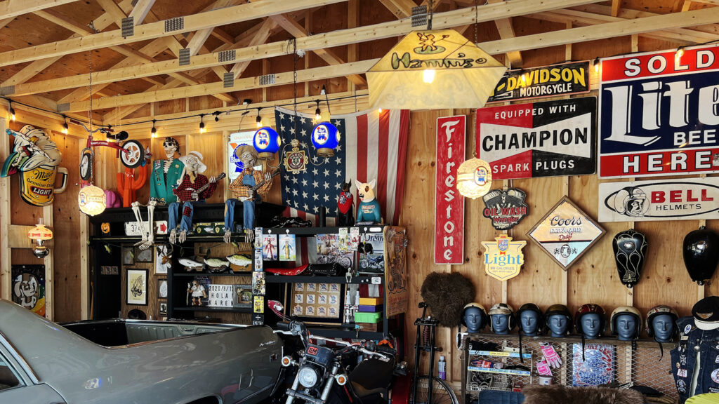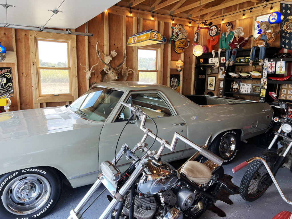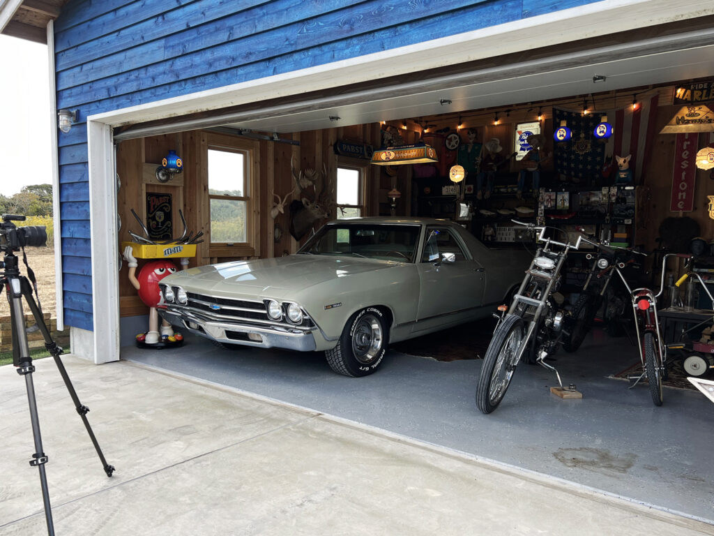 ブルーの外壁にエルカミーノが映える。アメリカ好きの秘密基地