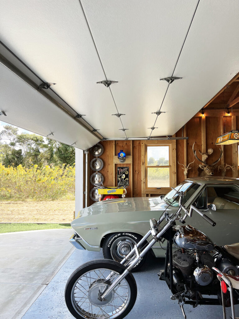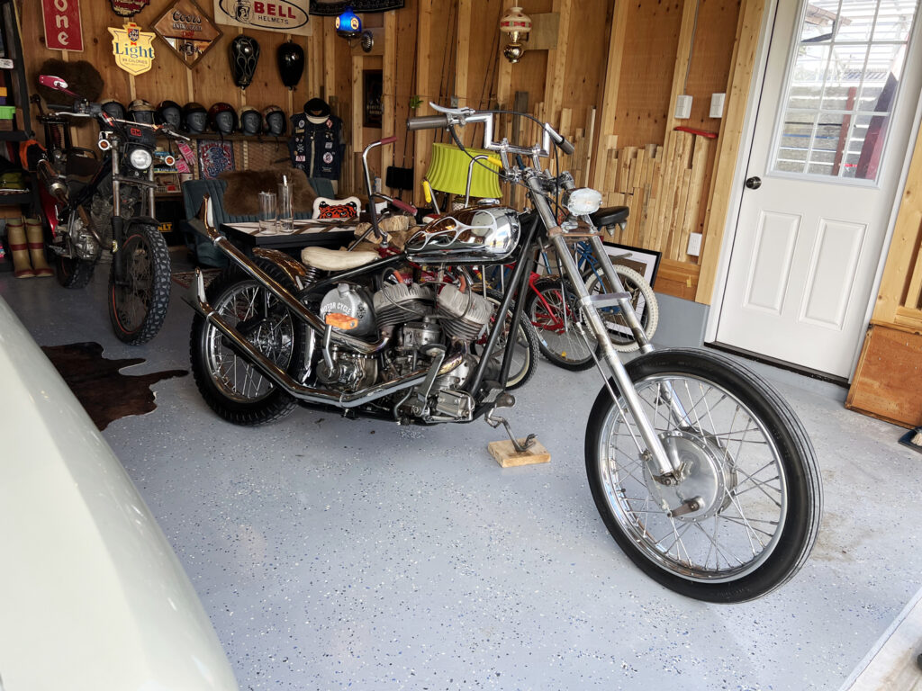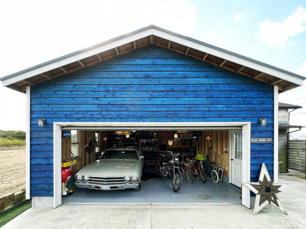 2020年完成。ブルーの外壁が目を引く車2台サイズのガレージ。屋内には、エルカミーノとバイク数台、自転車が格納されておりアメリカ好きのオーナーの好きなものがたくさん詰まった素敵な空間になっています。ガレージの床には「エポキシ・シールド」という屋内用のエポキシ樹脂塗料を塗布。チップを撒いて仕上げる塗料なので、見た目にも単調にならず格好いい仕上げになりました。