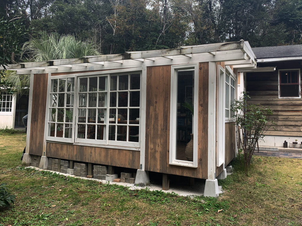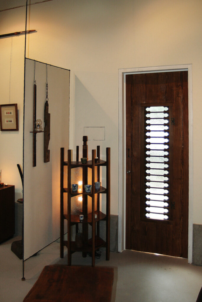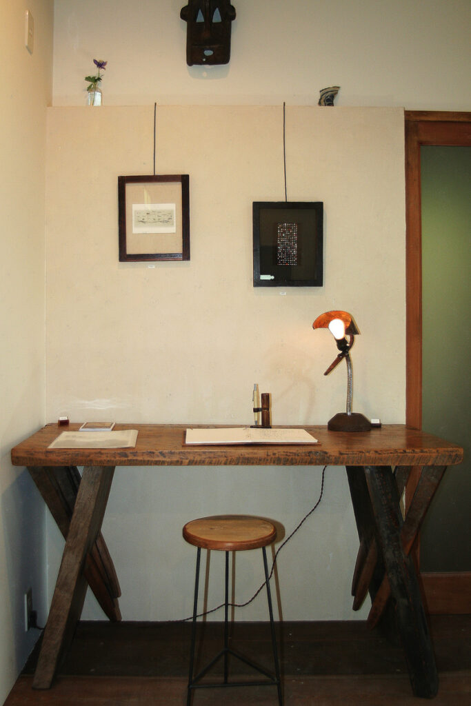 オーナーは古材を用いて、時を感じさせる味わい深い家具を作る、プロの家具職人。その腕を活かして、基礎工事、フレーミング工事、屋根工事以外は、造成から内装工事まで、ご夫婦での共同作業です。窓やドアなどの建具もすべて手作り。増築されたカフェスペースも、格子付きの窓が良い雰囲気で素敵です。