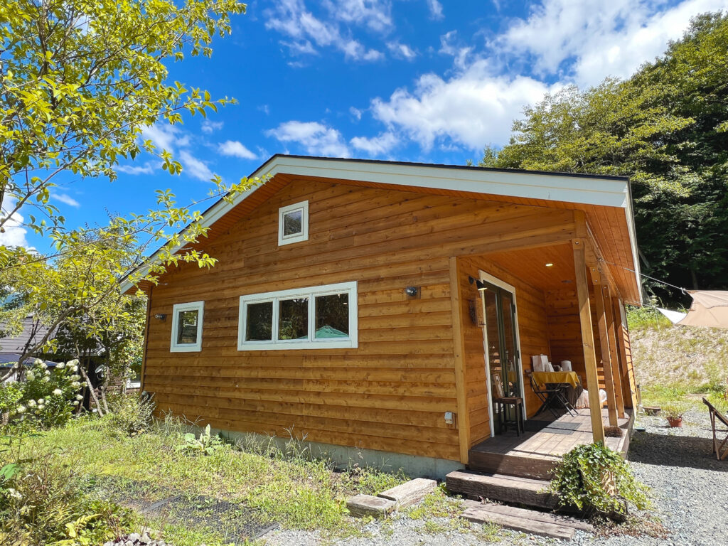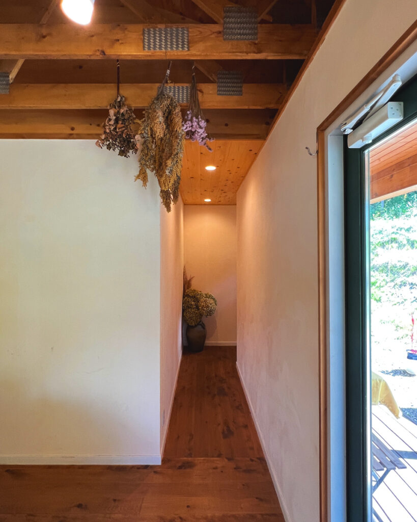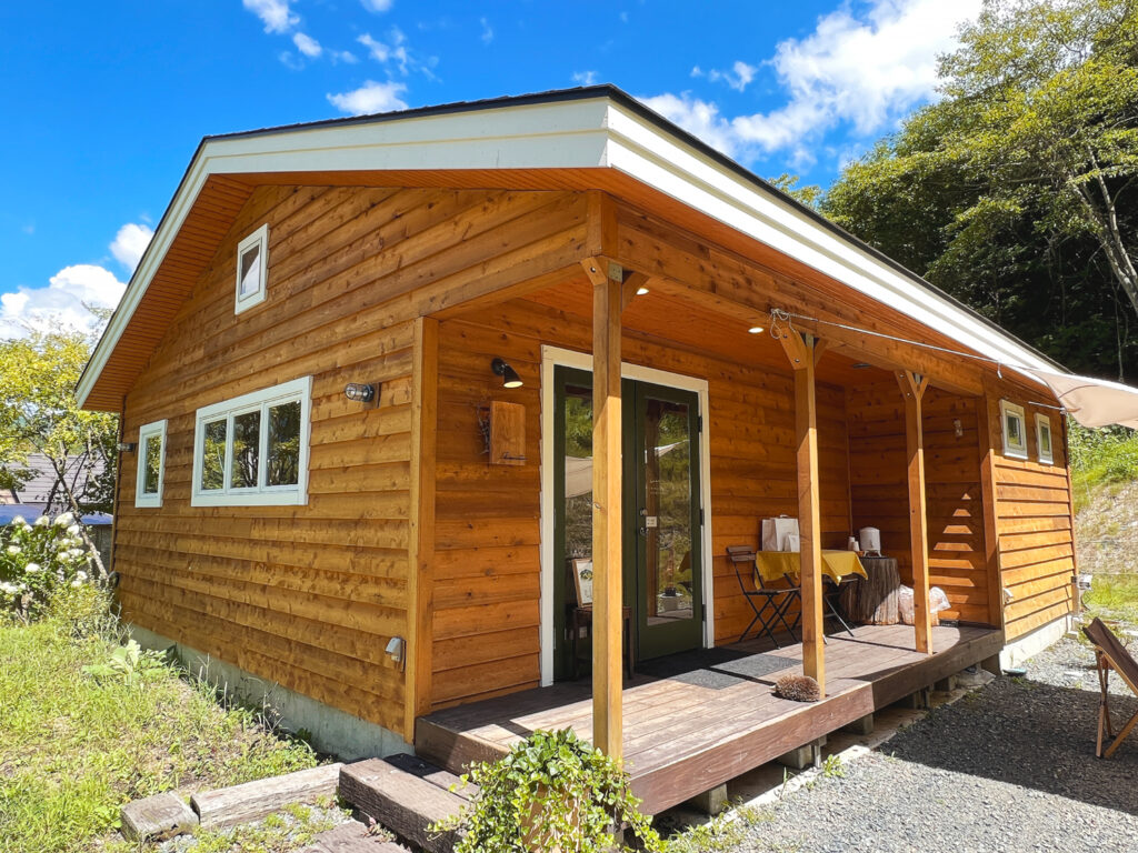 2020年末、群馬県の片品村にオープンした洋菓子店「Lammin(ラミン)」。クリアで塗装された外観が、片品村の豊かな自然に調和しています。片品村は垂直積雪量が「多雪250cm」と物凄く雪の降る場所なので、こちらの物件では、屋根構造であるトラスの材を太くするなどしてこれに対応させたのですが、屋内から見上げると、通常のものより迫力があって格好良いです。そしてこのトラスをあらわしにするため、屋根の野地板を二重にして断熱材をサンドする屋根断熱の工法を採用しました。オーナー様にも「エアコンが良く効いて、冬でもとても暖かい」と喜んで頂けました。