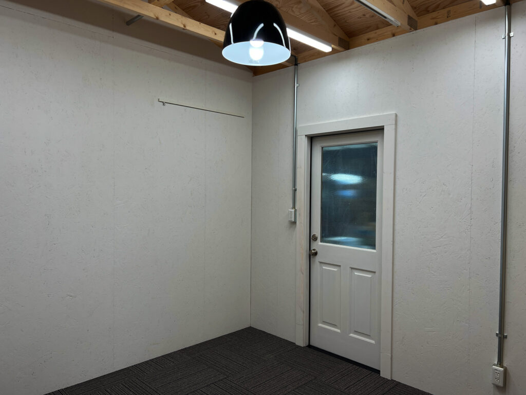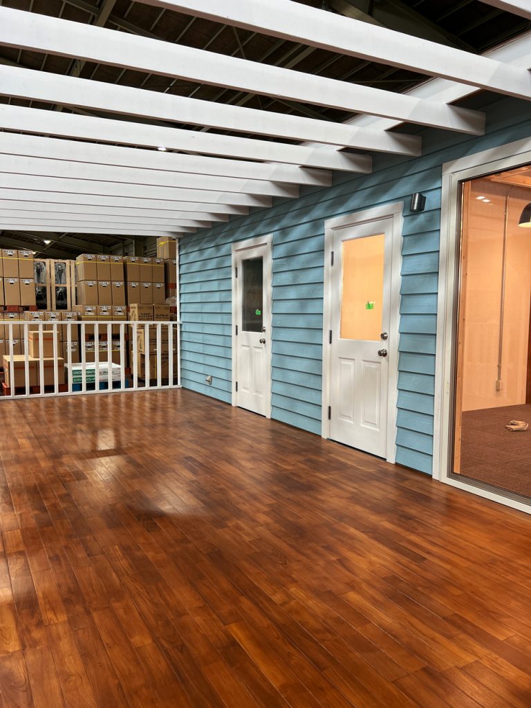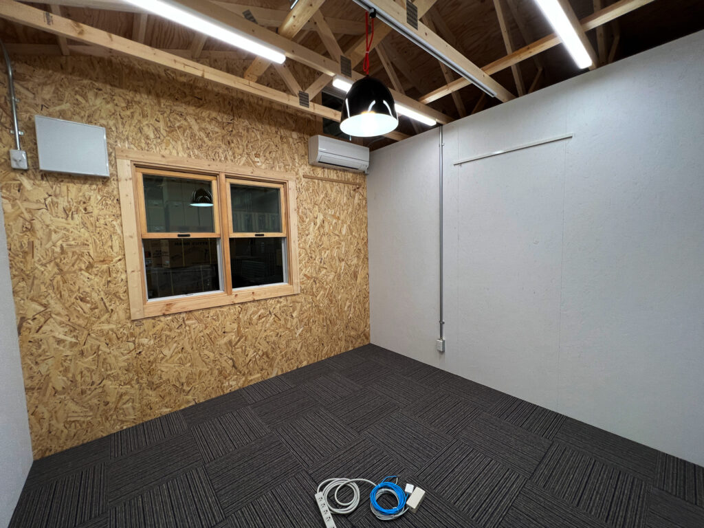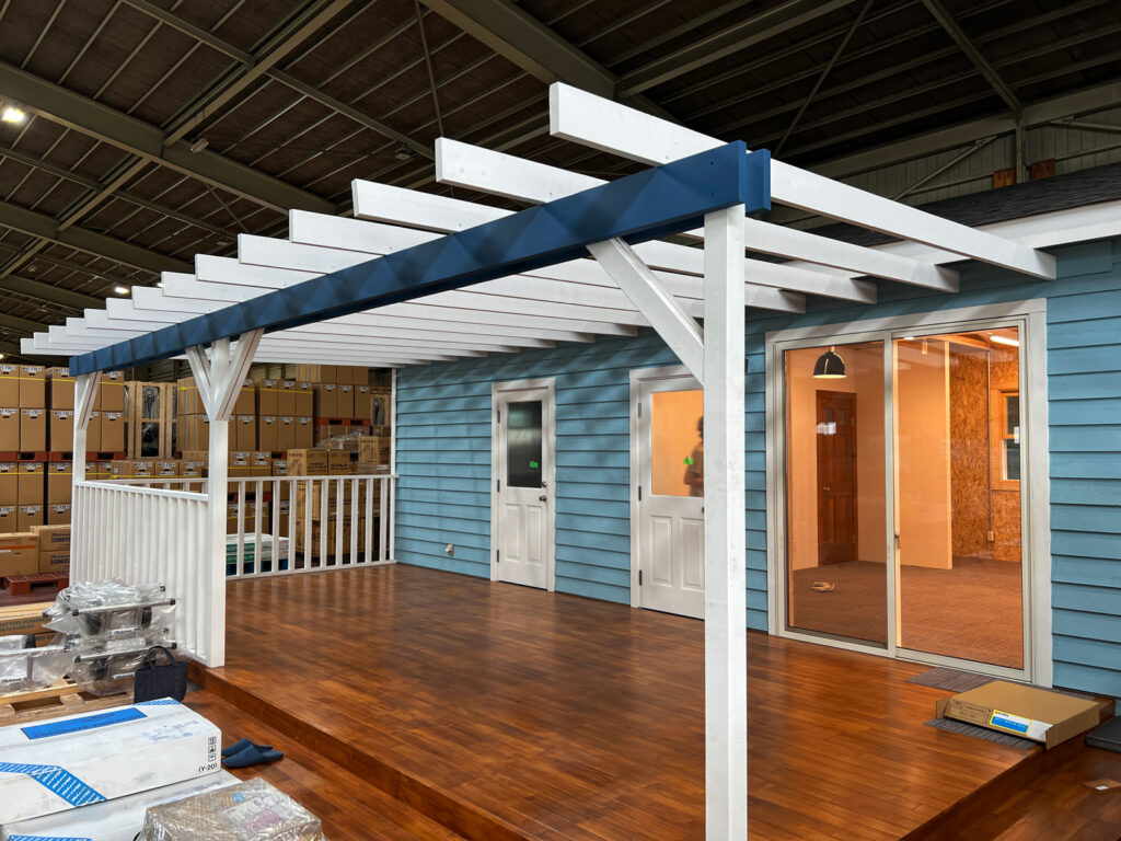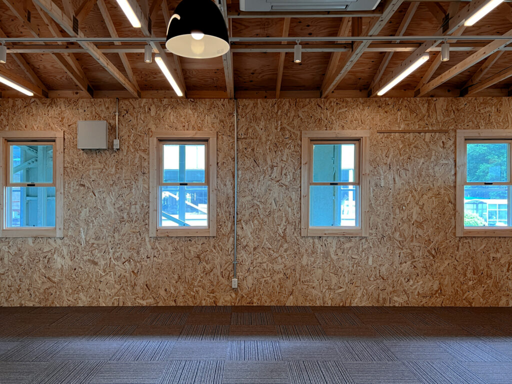 2023年完成。群馬県のとある企業の大型倉庫内に建てられた事務所棟。鮮やかなブルーの外壁が倉庫内でも一際目を引きます。屋根は断熱材を充填した二重屋根構造なので、トラスを現しながらもしっかりと断熱。床は屋内はOAフロアですが、デッキ部分にはチークのフローリング材を贅沢に使用したことで高級感のある外観に仕上がりました。