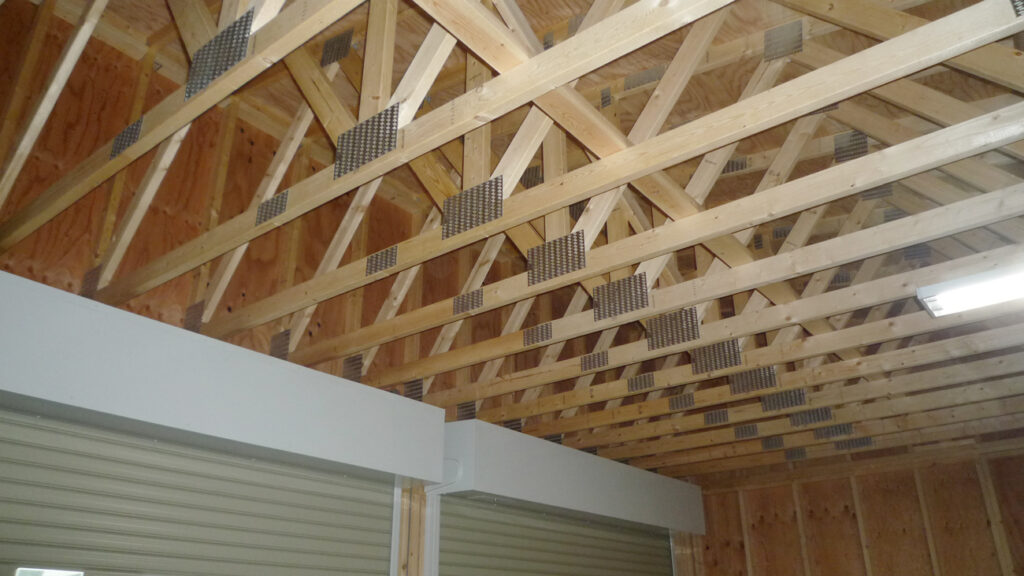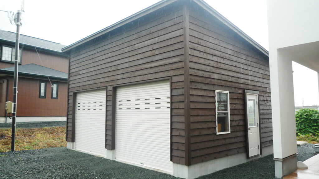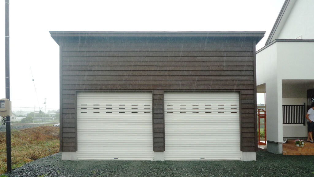 2015年完成。片流れトラスを採用した2台用ガレージ。幅2.8mの巻き上げシャッターを前面に2箇所設置し、使い勝手の良さとコストダウンを実現した。片流れなので最頂部が高く、開放感のある屋内空間になりました。