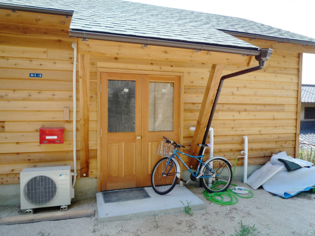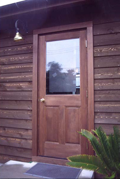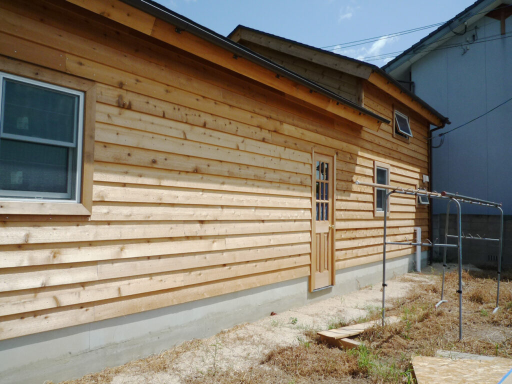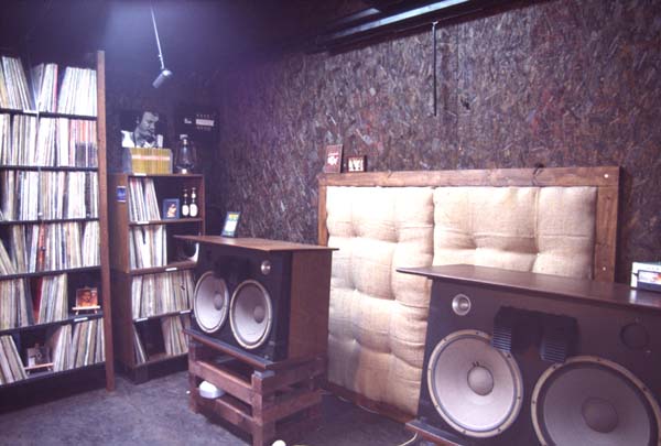 16×26タイプ(間口4.877m×奥行き7.925m)。防音と居住性向上のために、 床、壁、屋根にSIPs断熱パネル(OSBボードで発泡ポリスチレンをサンドイッチした構造用パネル)を使った構造としています。また、トラスではなく屋根梁構造として太い梁をあらわし、内壁もOSBボードにステイン塗装を施し、ジャズの雰囲気によく合った内装に仕上がっています。大きなテーブルは2×4材でできてます。