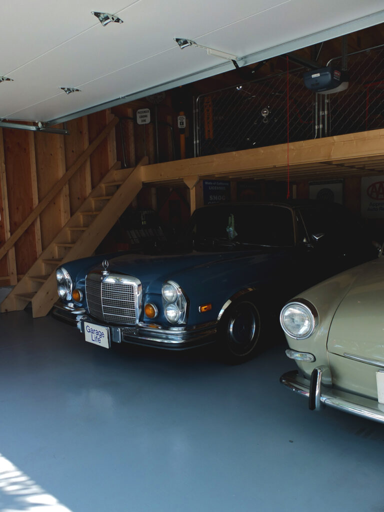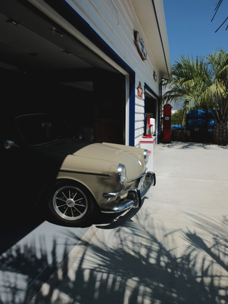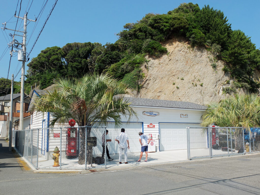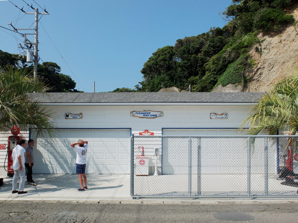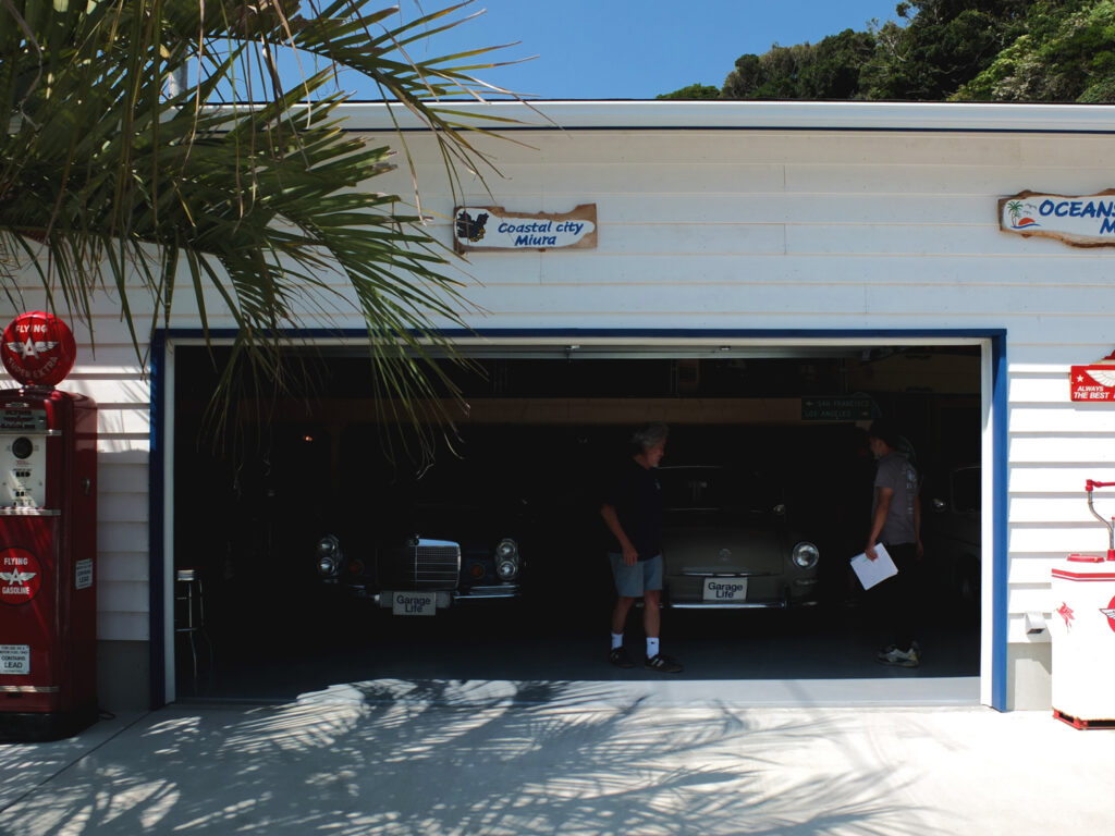 2022年完成。海からほど近い場所に建てられた、西海岸を思わせるアメリカンガレージ。白い外壁にブルーの縁取りが爽やかで、晴れた空がよく似合います。ガレージドアを軒側に2台並べ、車庫内には4〜5台の車が格納可能。また建物全体の壁高さを通常より30cm高くして、一部にロフトを作製。オーナーがアメリカから買い付けてきたコレクションが所狭しと並びます。