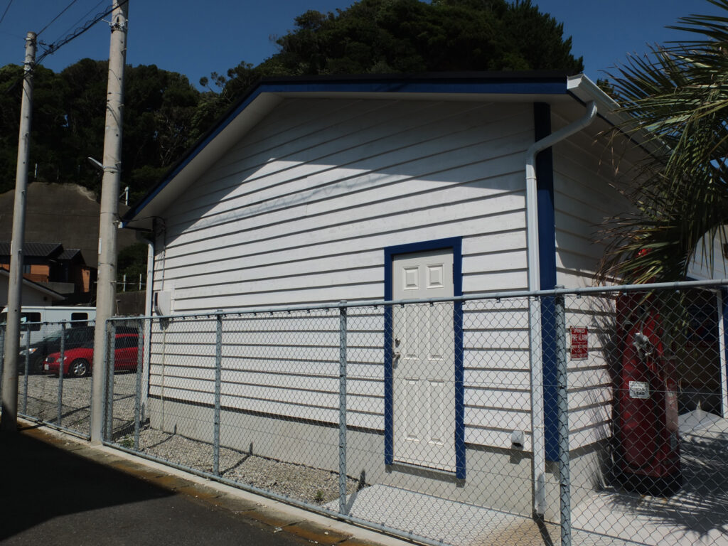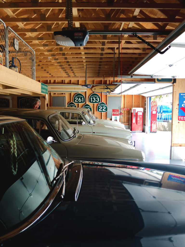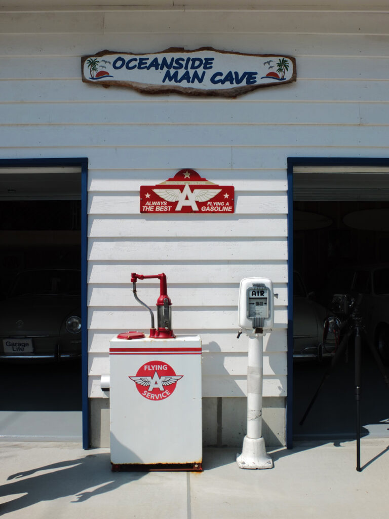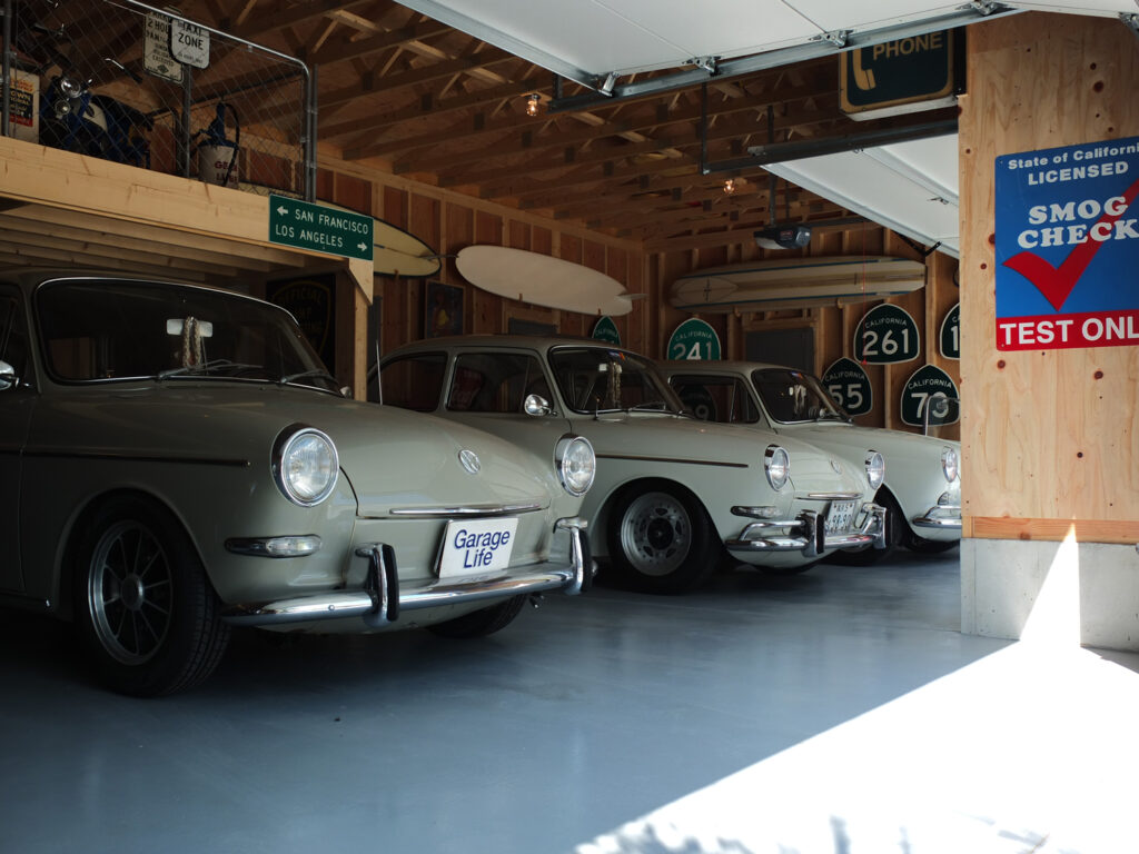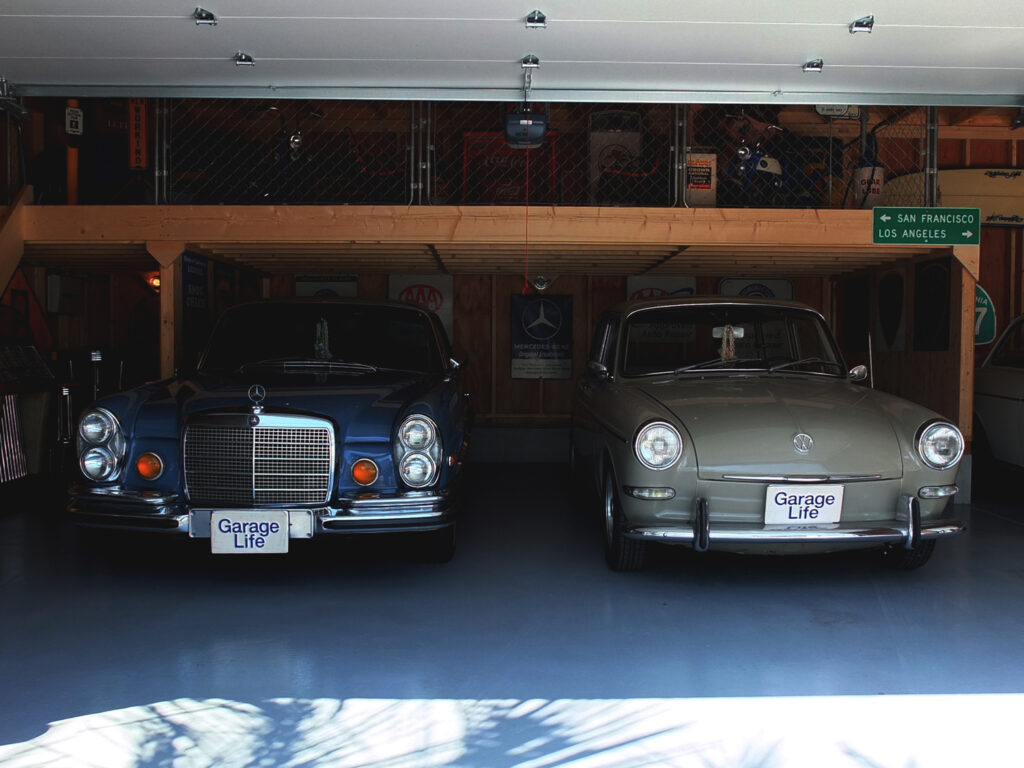 2022年完成。海からほど近い場所に建てられた、西海岸を思わせるアメリカンガレージ。白い外壁にブルーの縁取りが爽やかで、晴れた空がよく似合います。ガレージドアを軒側に2台並べ、車庫内には4〜5台の車が格納可能。また建物全体の壁高さを通常より30cm高くして、一部にロフトを作製。オーナーがアメリカから買い付けてきたコレクションが所狭しと並びます。