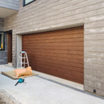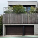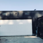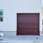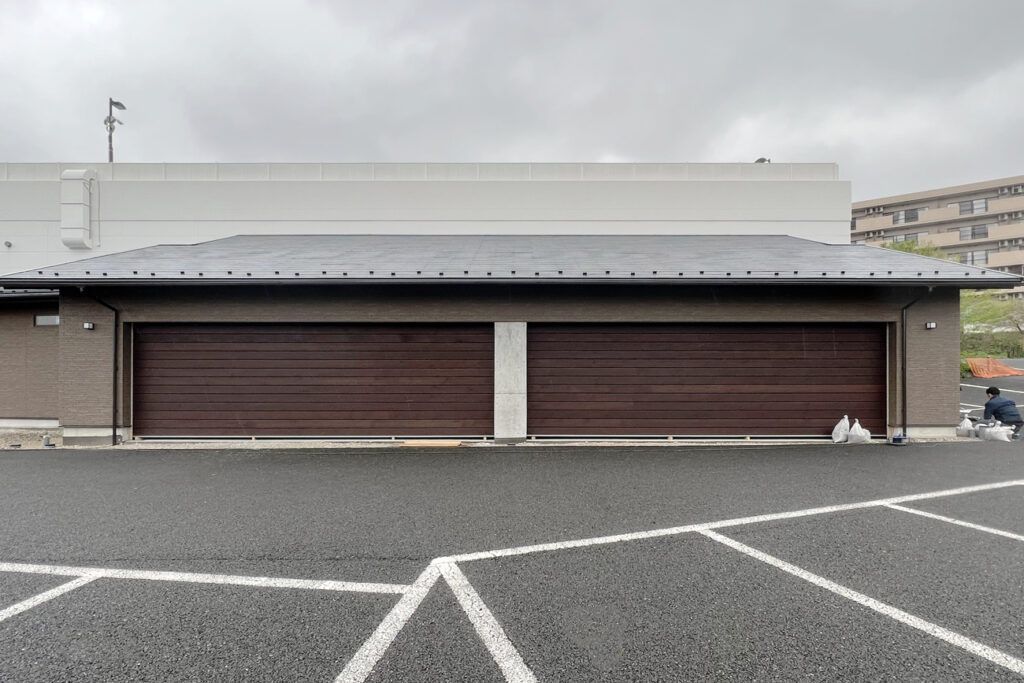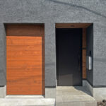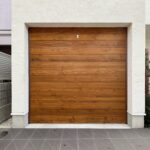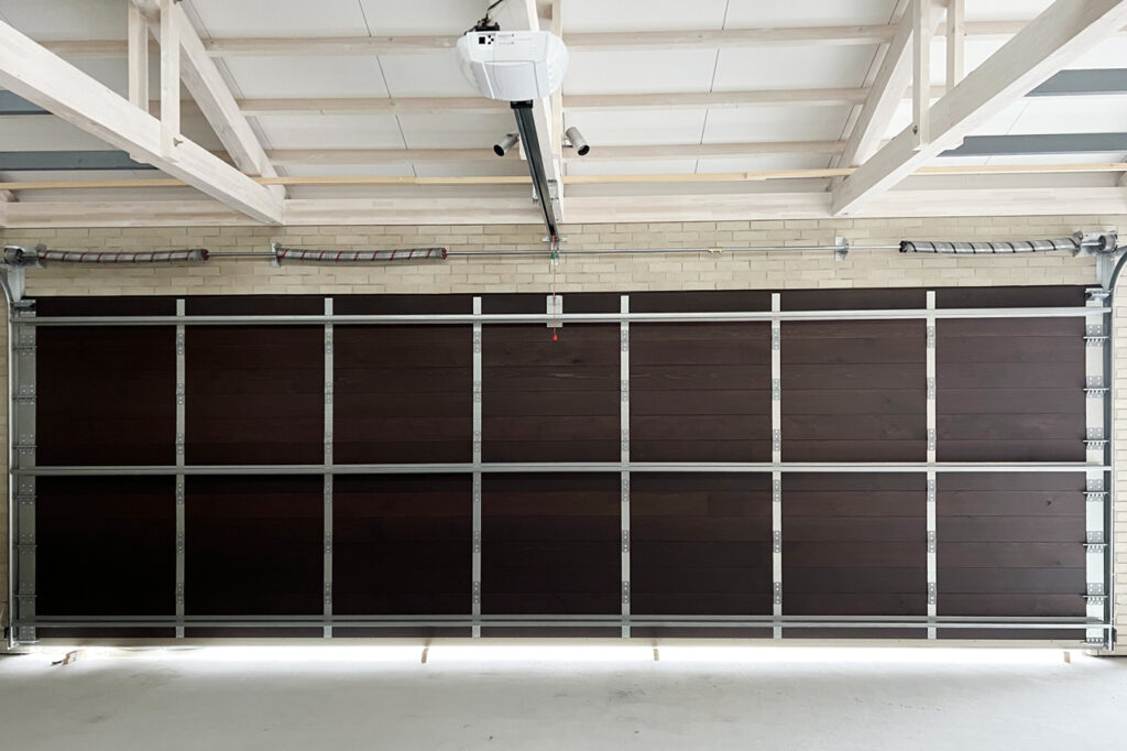 2022年施工。在来工法で建てられた大型のガレージに横並びに2台取り付けられた幅7,500mmのガレージドア。併せて15メートルの木製シャッターが開閉する様子は絵的にはとても迫力がありますが、ドイツ・マランテック社製のオープナーにより、通常のウッドソリッドドアと同様のとても静かでスムーズな開閉を実現しています。
