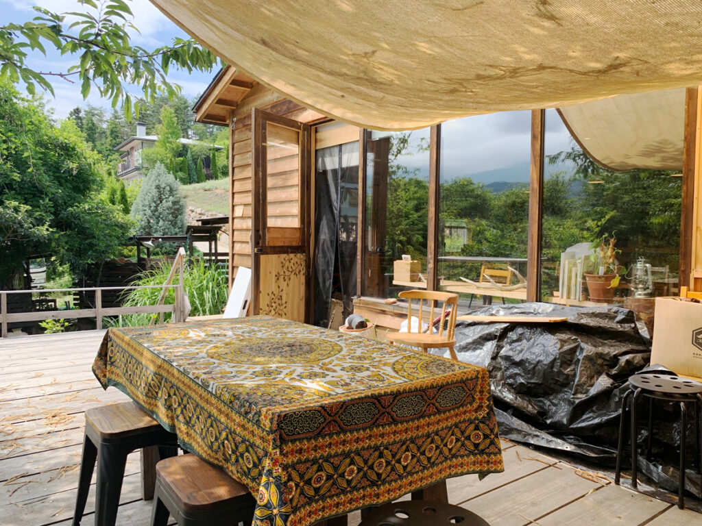 基礎・構造と屋根工事以外はオーナー自ら施工。 内装や建具、デッキ、焚火場、はたまた小物まで手作り。