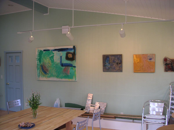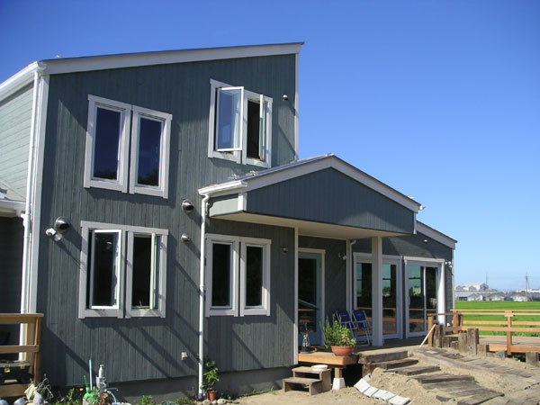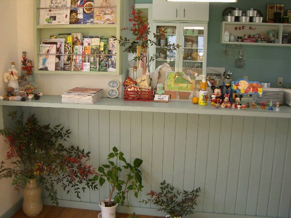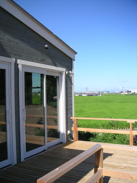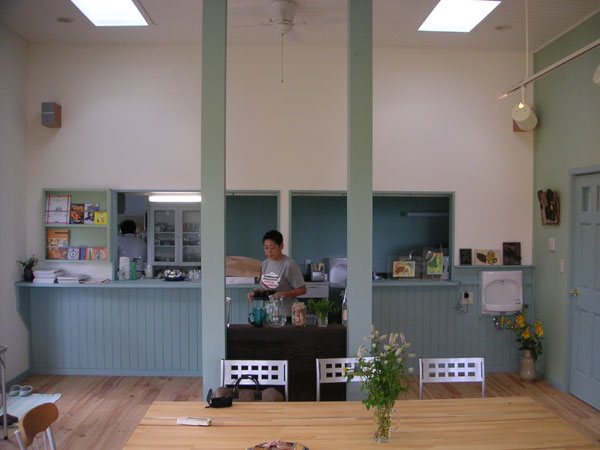 広々とした環境が気持ちよい、土日オープンのカフェ。奥さん手作りのケーキが評判です。完全にフリー設計で、1階は店舗、厨房、居室、2階は洋室×1室という間取りで店舗兼住宅としてお使いです。店舗の内壁仕上げは有孔ボードにオイルペイント仕上げ、天井はパイン材にオイルペイント仕上げ。床にもパイン材を使い、シッケンズのフロア用塗料で仕上げています。 外装塗料:オリンピックステイン「#908」「アウトサイドホワイト」