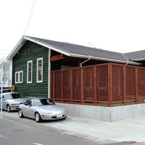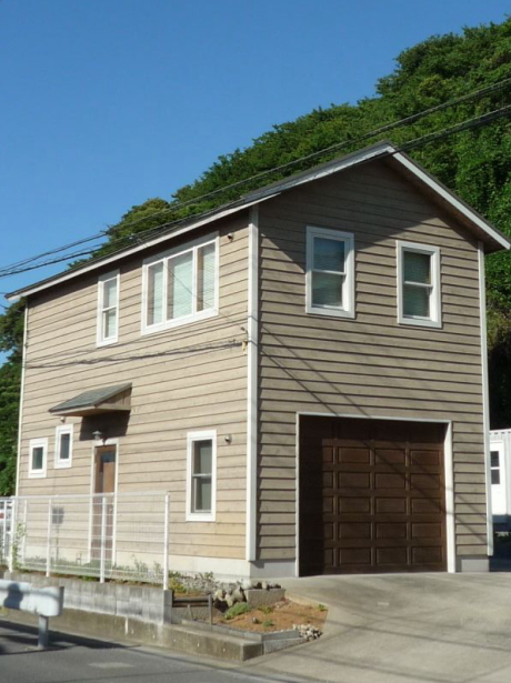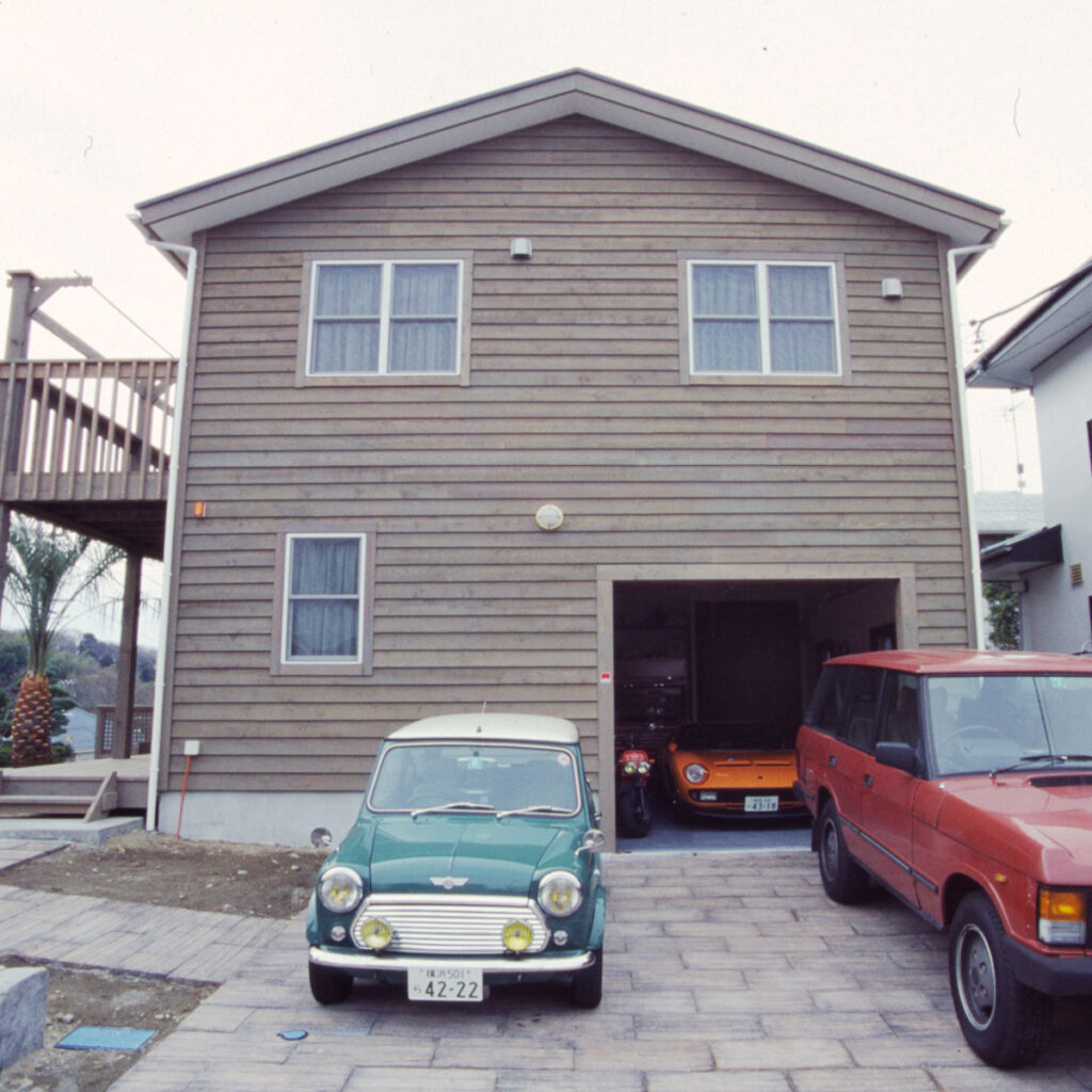 趣味に囲まれるガレージ。裏手のシダーデッキが叶える、至福のひととき。
