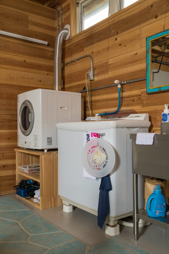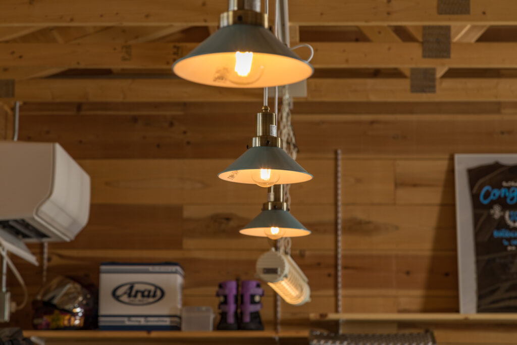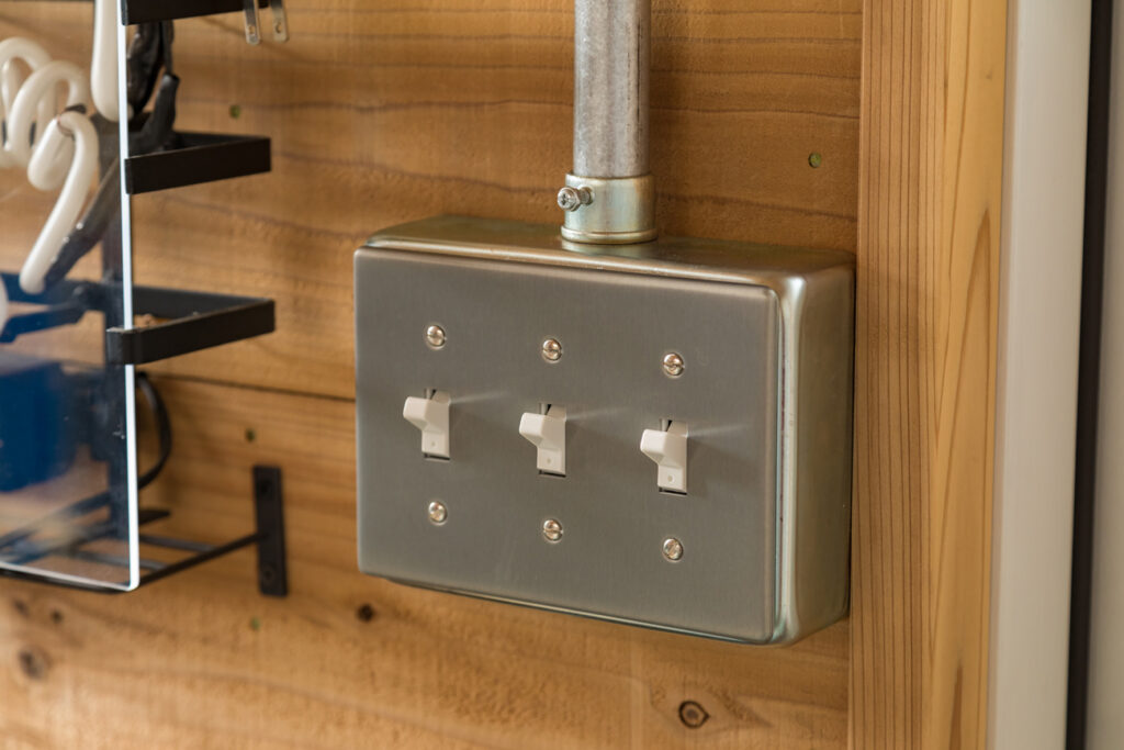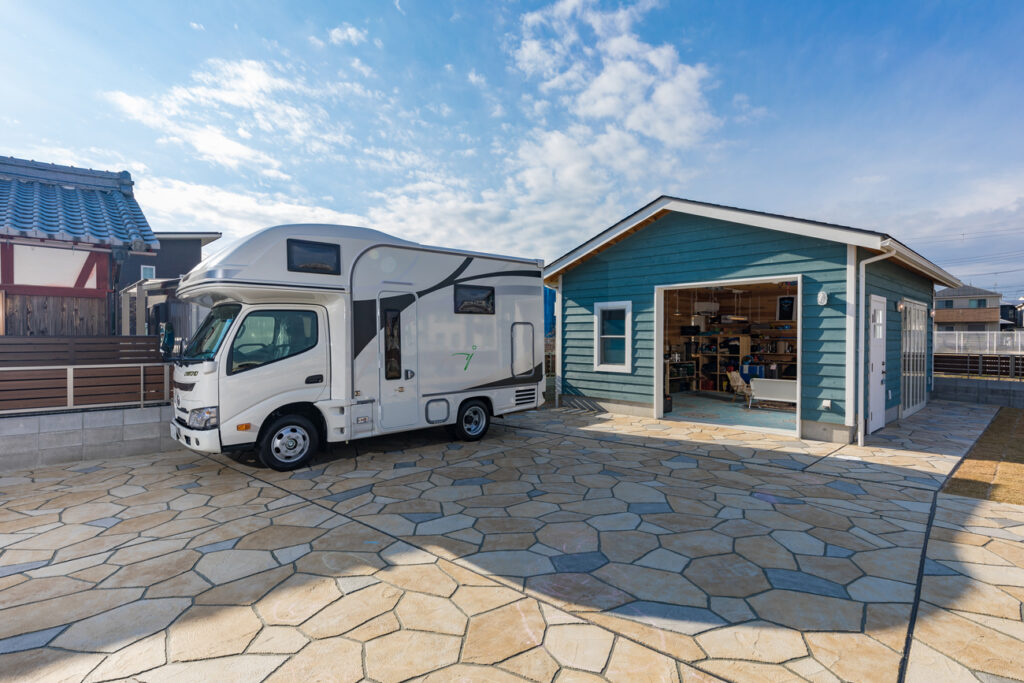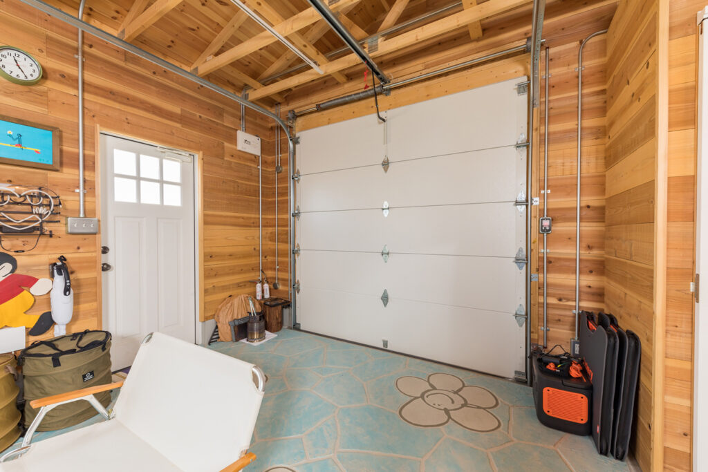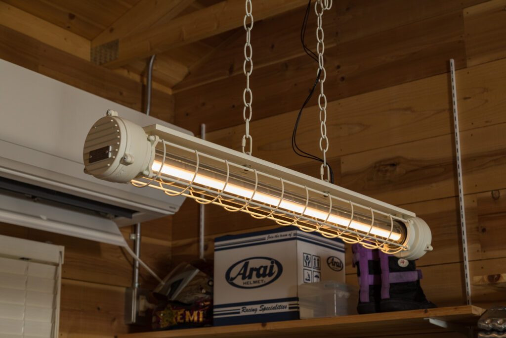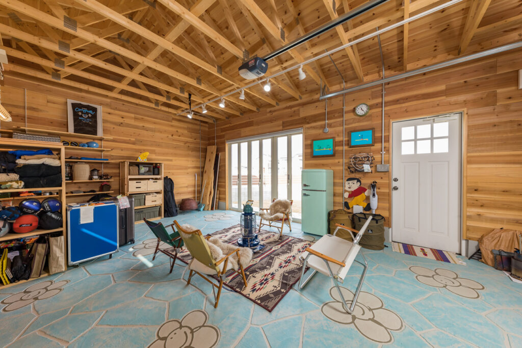 2022年に完成したガレージ。車庫ではなく、趣味のアウトドア用品の収納と作業部屋としてのガレージ。大開口の折れ戸を開ければ、半屋外のような開放感のある空間に。インダストリアルな雰囲気の照明器具や、現しになった鉄管の配線は楢崎住宅のアイデアです。外壁はオリンピックマキシマム ソリッド「Blue Blood」で塗装。