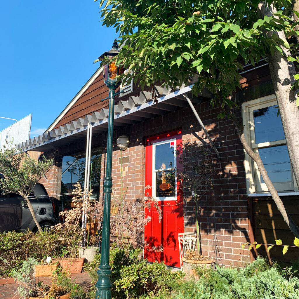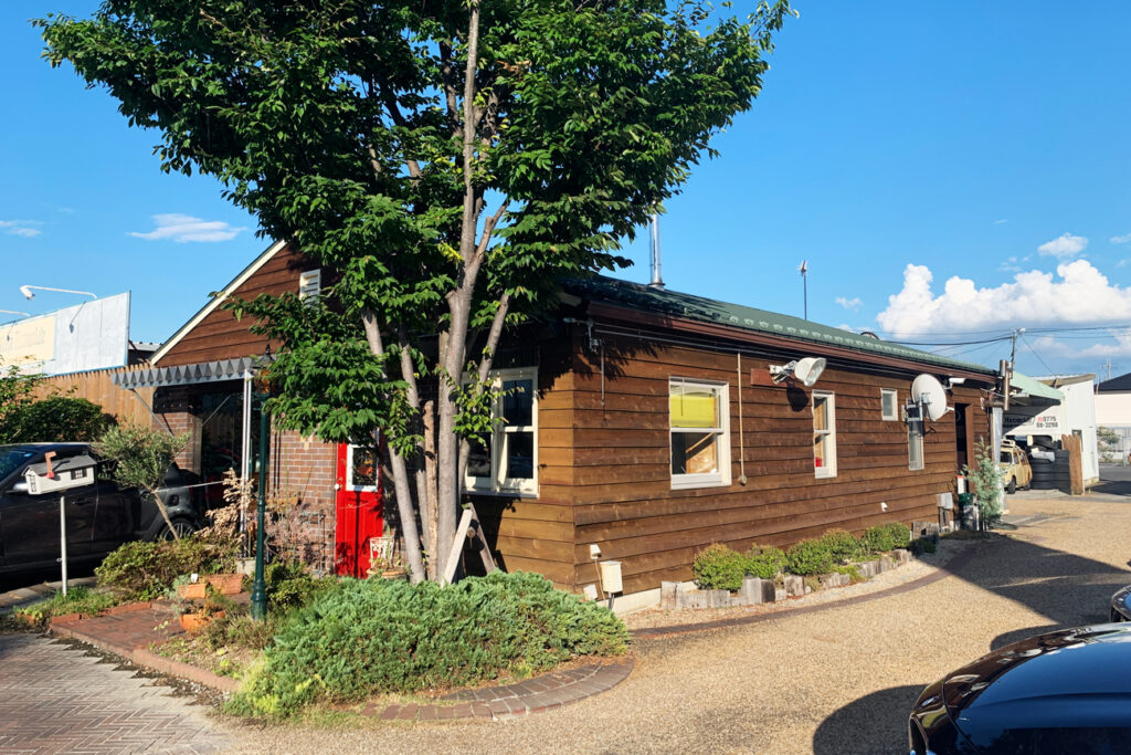長く愛用されるシダーガレージ。塗装トラスがアクセントの、開放感あふれる店舗。
