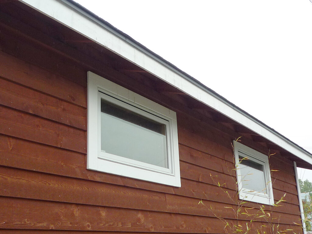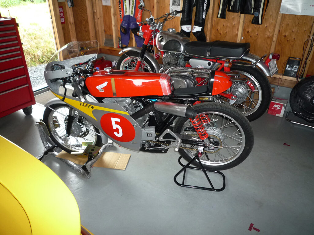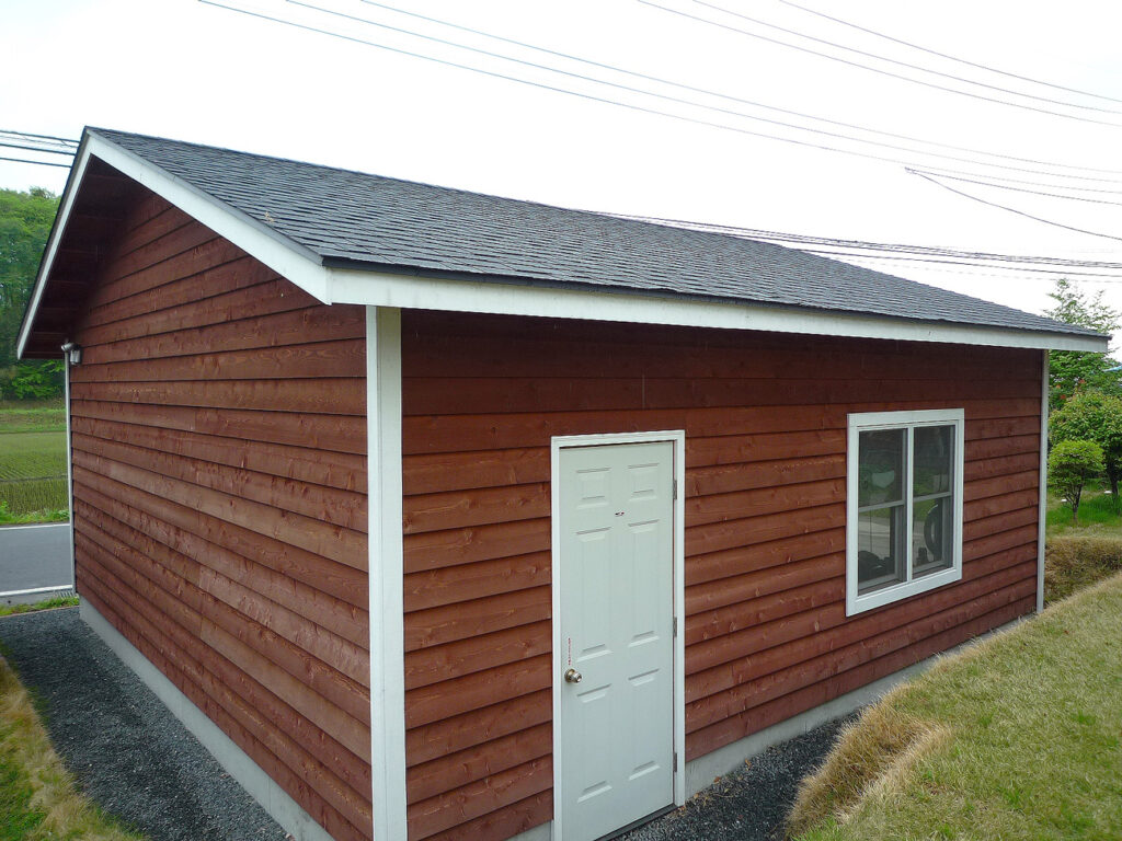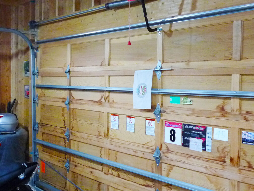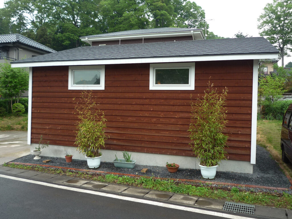 2008年完成。オプションは電動オープナーと道路側の横長の窓2か所。道路側から覗き込まれないように、できるだけ高い位置に取り付けています。標準仕様に近い、オーソドックスなデザインのガレージは、車1台とバイク8台が納まり、レストアやメンテに大活躍。