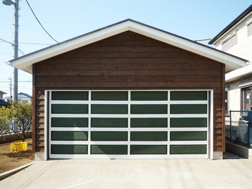 2012年完成。ブラウンの外壁に対し、ガレージドアは鮮やかなグリーンとホワイトのツートンで塗装。印象的な外観になりました。幅18フィートのガレージの場合、9フィート幅のガレージドアが標準仕様ですが、オーナーの希望でできるだけワイドなガレージドアを採用。これなら車の出し入れも楽々です。