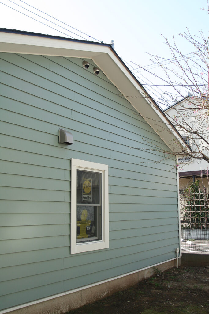 2008年完成。 準防火地域での建築のため、外装は母屋に合わせて窯業系「東レ・ラップサイディング」を採用。内装はケイカル板にEP白塗装。また、ガレージドアはスチール製の窓付きを採用し、妻壁の半円窓と相まって洋風なテイストに。