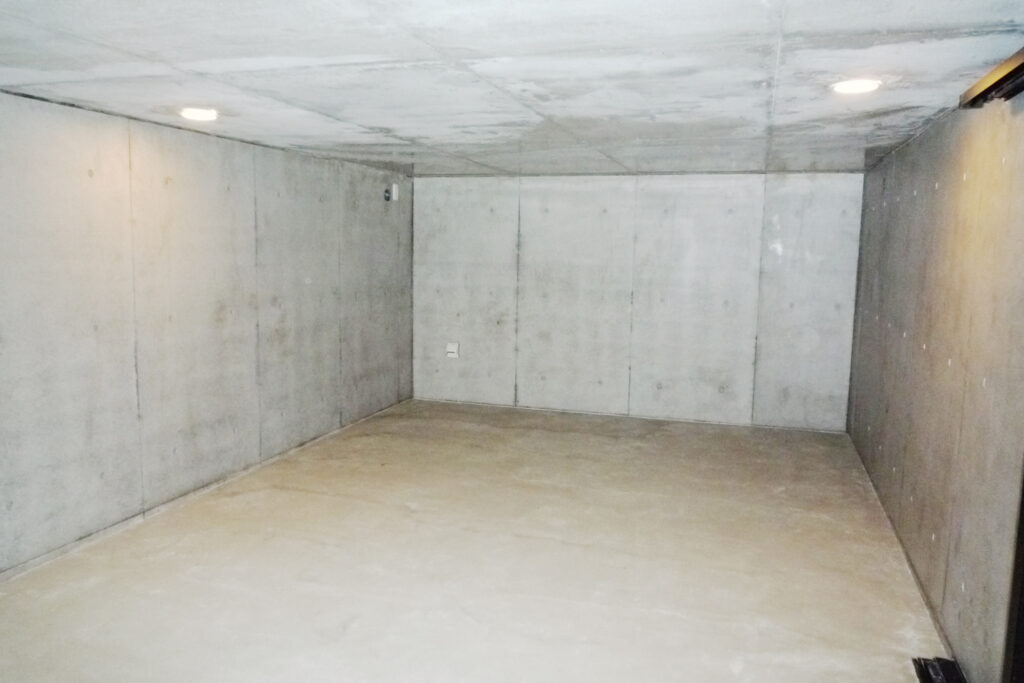 オーナー自作のガレージに設置。黒の外装に白のレイズドパネルドアが映える。
