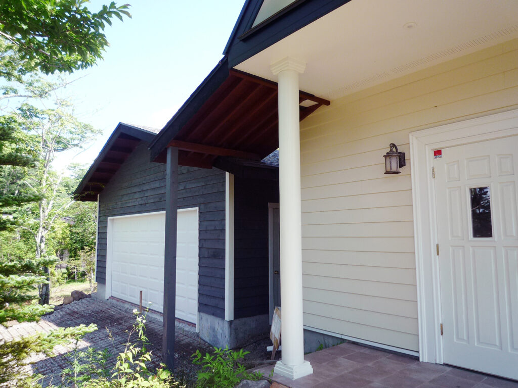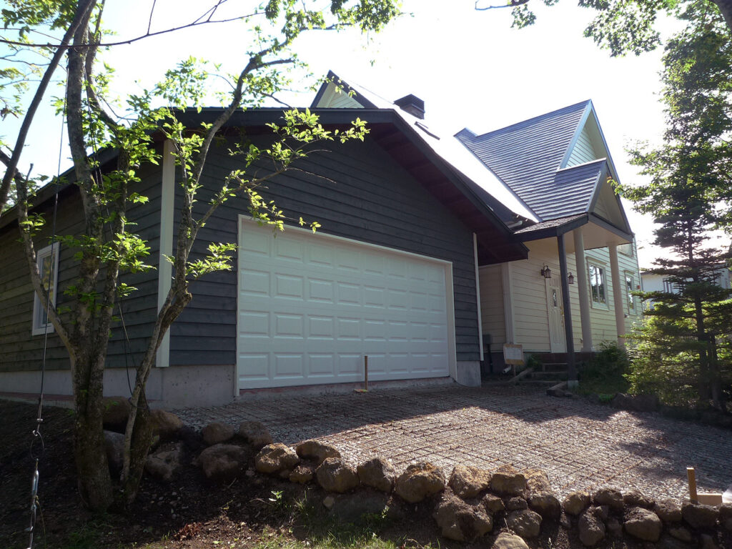 2012年完成。西洋風の母屋の隣に建てられたシダーガレージ。回りの風景にもよく調和しており、そこだけまるで外国のような雰囲気になっています。母屋側の軒の出は延長したことで、雨に濡れない屋外スペースを確保。道具を置いたり、薪を保管するスペースとして最適です。